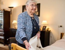 In Bolderbörg respecteren ze de grenzen van mevrouw Oosterveld. “Wat ik zelf nog kan, laten de verzorgenden me ook zelf doen. De dames helpen me wel bij het douchen en bij het aan- en uittrekken van mijn steunkousen. Maar mijn bed wil ik zelf opmaken, want dat lukt me nog prima. Ik heb een mooie sprei van mijn schoondochter gekregen en die leg ik dan over mijn bed heen.”